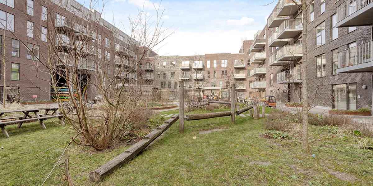 I gårdrummet er der etableret et grønt miljø, der indbyder til leg, hygge og fællesskab.