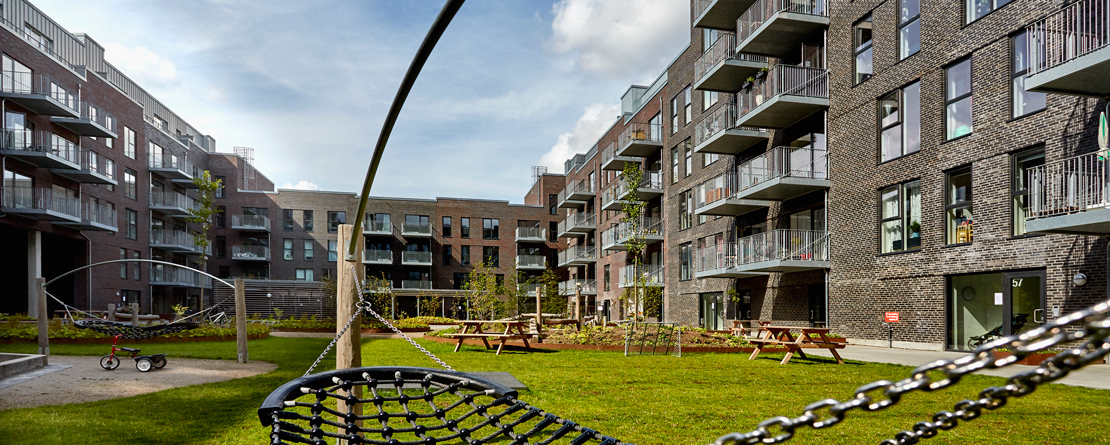 I gårdrummet er der etableret et grønt miljø, der indbyder til leg, hygge og fællesskab.